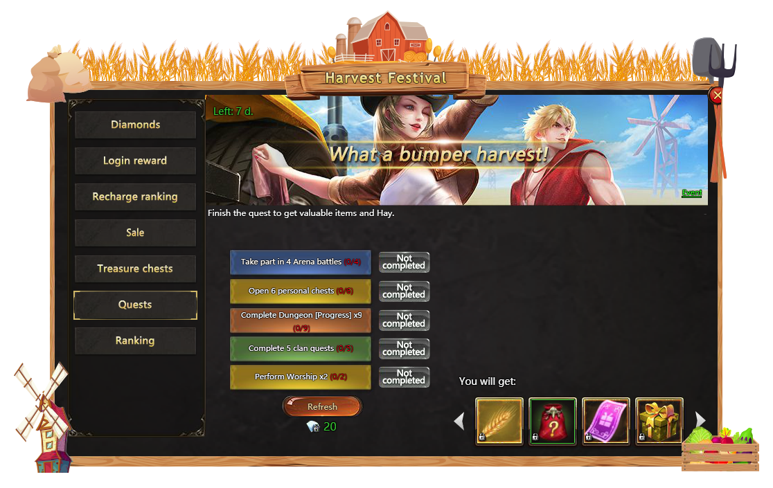 Quests - complete daily quest to receive lots of gifts!