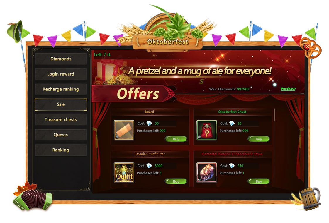 It's so sad Oktoberfest has been cancelled everywhere this year... but not in Rise of Angels! Fun activities, delicious treats and remarkable outfits will be traditionally waiting for you from 6am September 25 to 6am October 2. Have you been deaming of eating some chicken wings for a long time? Or flying on the keg? Or maybe making friends with a cute dachshund? Then welcome to Oktoberfest!