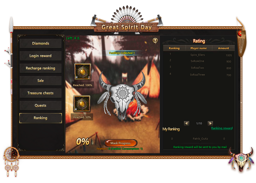 When nature is going to winter hibernation, the time of Great Spirit is about to come. It's mission is to protect lands during frosty season, but traditionally various clans from different territories have to gather together and start a grandiose fest in honor of their defender. So let Great Spirit Day begin and may it bring many adventures, rewards and new friends! All of this will be awaiting from 6am October 16 to 6am October 23 - have fun!