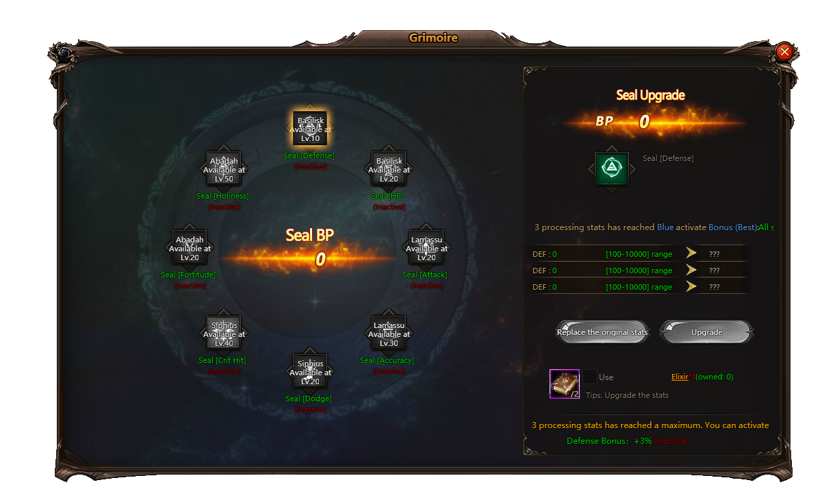 To upgrade the seal you require The Seal Processing Book and the Elixier. Both you can obtain in the in-game Store.
