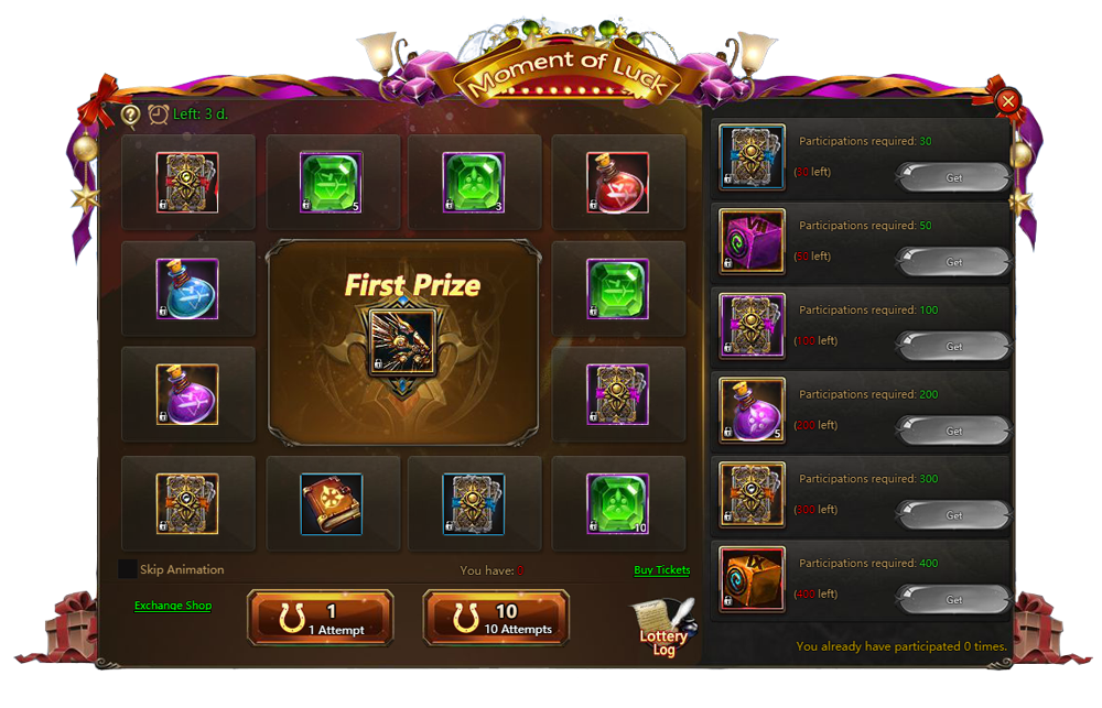 Starting from 5:00 am 12.14.2018 till 11:59 pm 12.16.2018 we run Moment of luck event. Test your luck and get a chance to win a lot of valuable trophies.