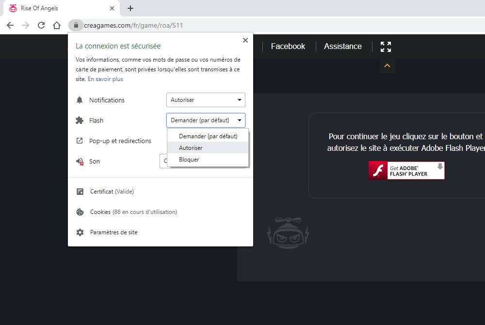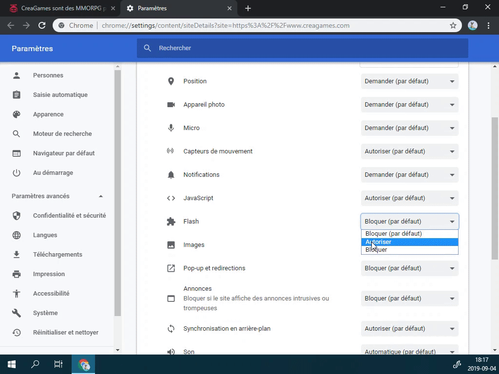 - À droite de "Flash Player" choisissez l'option "Autoriser"