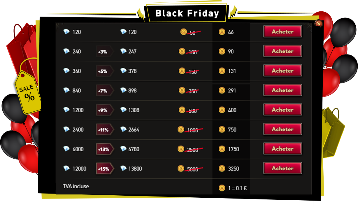 De 00h 00 (29 novembre) à 00h 00 (2 décembre) tous vos achats qui sont fait dans le jeu (quand vous cliquez "paiement") sont plus profitables.