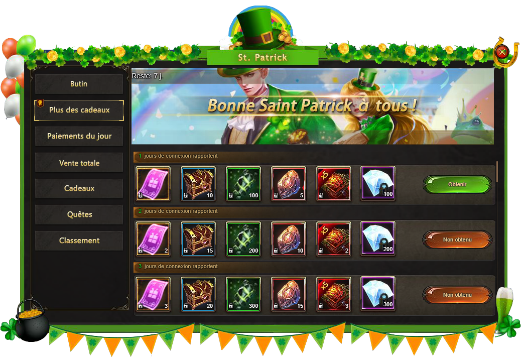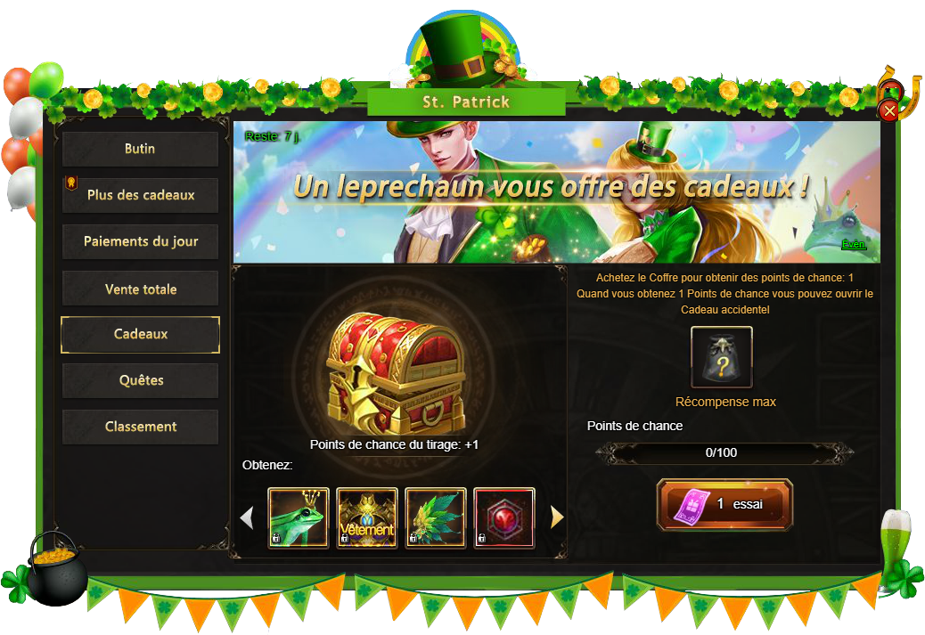 Un leprechaun est apparue, chers héros. Il vous donnera un coffre d'or si vous avez de la chance ;)