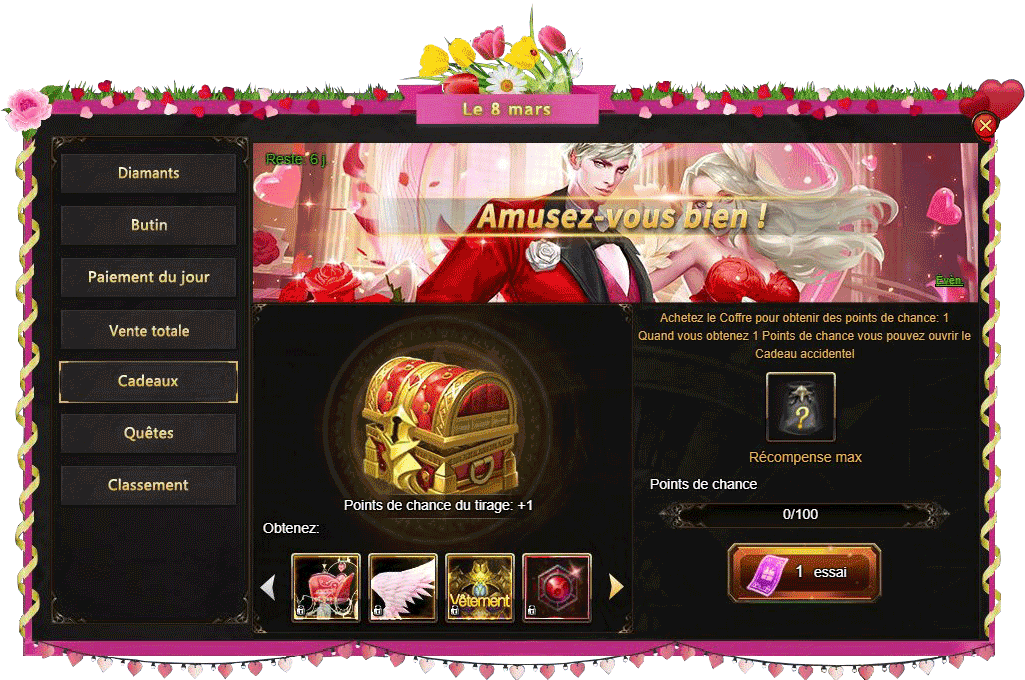 Il est temps d'annoncer l'événement de printemps le plus attendu - la Journée internationale de la femme débutera le 05.03.2021 et durera jusqu'au 12.03.2021. Des prix impressionnants, des activités amusantes et beaucoup d'amis!