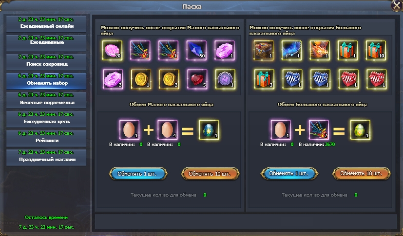 Получайте награды за онлайн, пополнение счета, сбор яиц и прохождение подземелий. В Праздничном магазине вас ждет много полезного, в том числе Книги улучшения умений персонажа - не упустите редкий шанс!