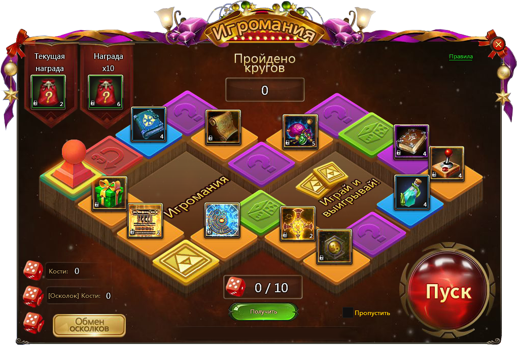 Участвуйте в событии «Игромания» – бросайте кости, перемещайтесь по игральной доске и получайте призы. Испытайте удачу, и пусть улыбка Фортуны принесет вам множество призов!