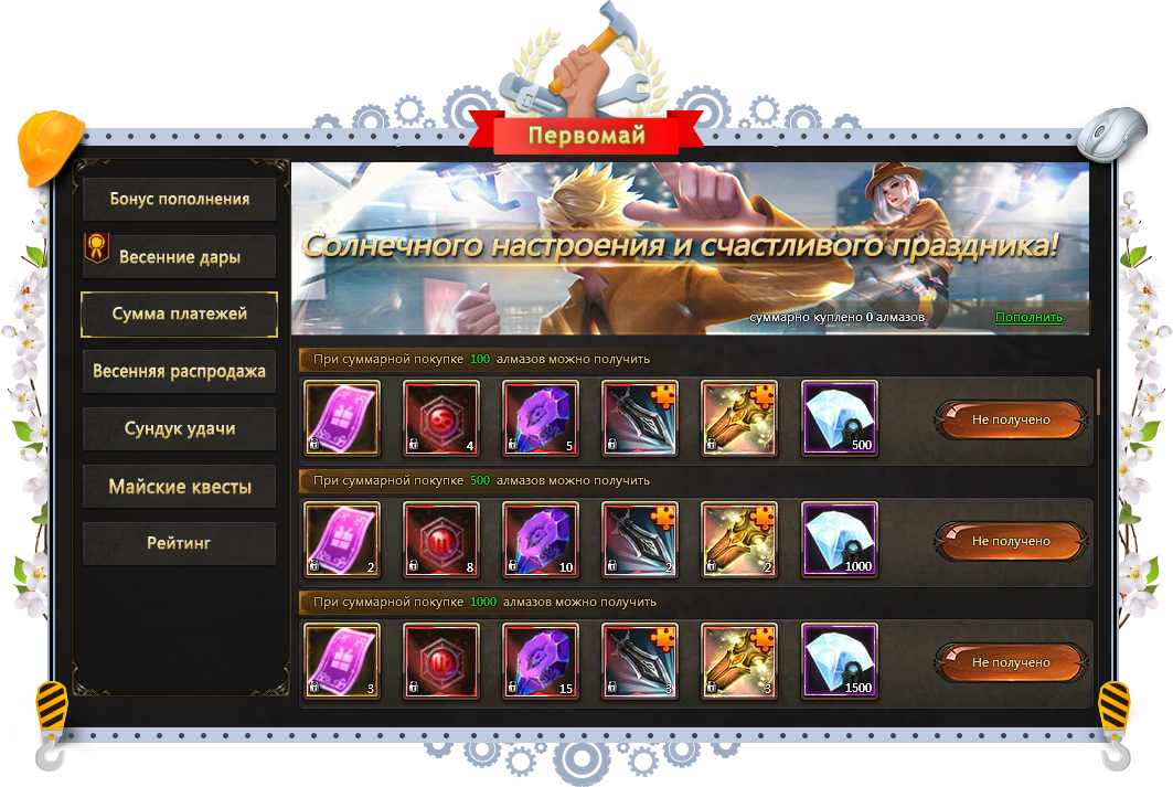 При общей покупке алмазов на определенную сумму вас ждут приятные бонусы в виде ценных призовых наборов.