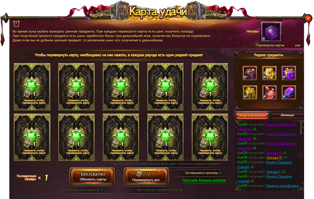 Переворачивайте карты и получайте ценные призы! В каждом раунде есть шанс выиграть один из редких предметов, а сама карта, содержащая такой приз, может принести бонус умножения наград последующих карт этого набора.