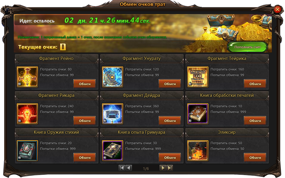 В рамках данной акции 1 потраченный алмаз равен 1-му очку трат. Копите очки и приобретайте разнообразные ценности в обменнике события. Обратите внимание — по окончании ивента очки трат обнуляются.