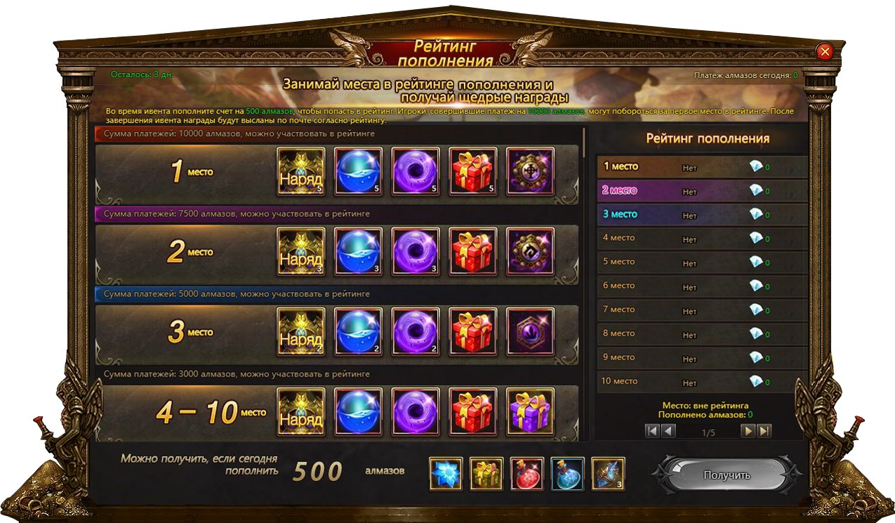 Приобретая алмазы в период действия данной акции, у вас есть шанс занять почетное место в специальном рейтинге и стать обладателями множества трофеев. Кроме того, при пополнении счета на 500 и более алмазов за один день вы сможете получить ценный призовой набор.
