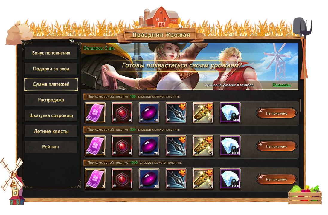 При общей покупке алмазов на определенную сумму вас ждут приятные бонусы в виде ценных призовых наборов.