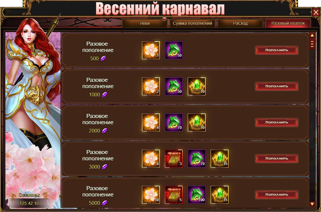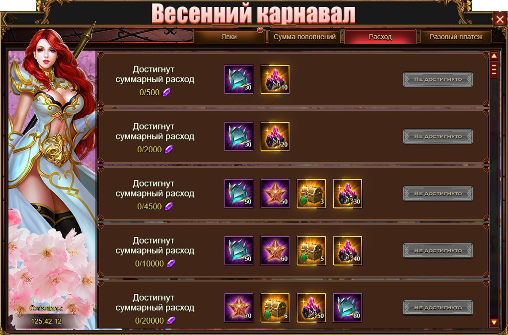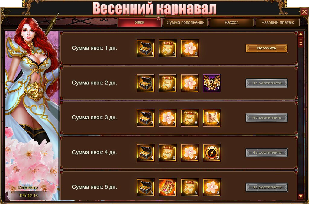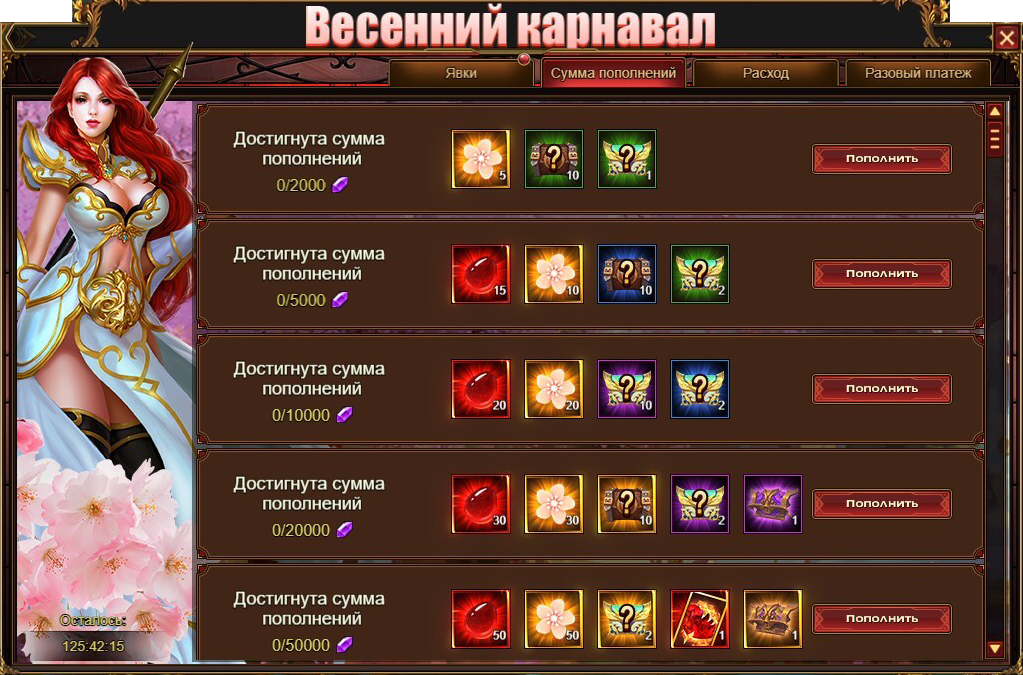 Пополните счет на определенные суммы за пять дней события и получите ЦветкиКамни МудростиСундук магических камней 1 ур., Сундук магических камней 2 ур., Сундук магических ядер 1 ур., Сундук магических ядер 2 ур., Сундук магических ядер 3 ур., Сундук магических камней 4 ур.Сундук магических ядер 4 ур., [Карта] Сердце Дракона, Сундук снаряжения героя (фиол.), Сундук снаряжения героя (оранж.)Сундук магических камней 5 ур.Сундук магических ядер 5 ур., [Карта] Тор x2