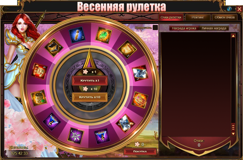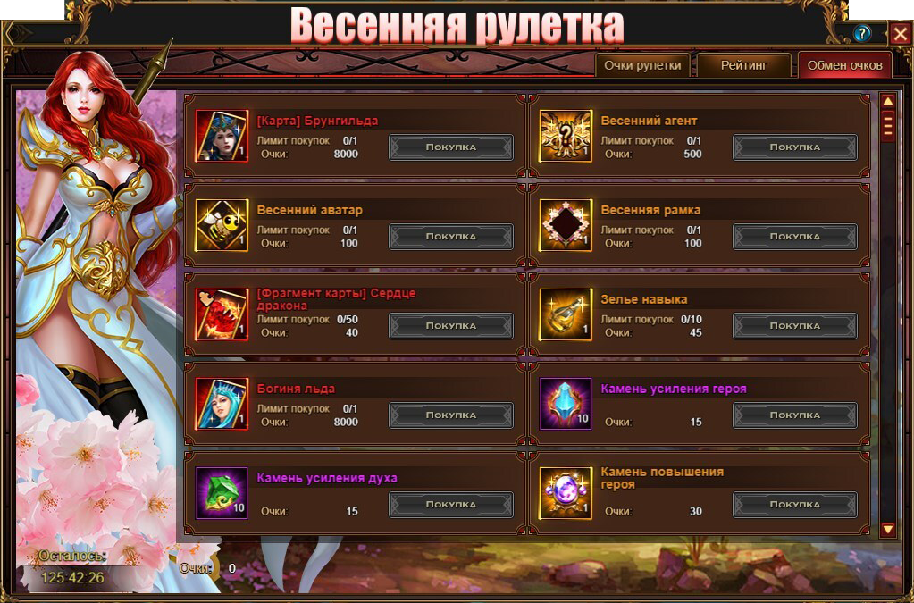 Полученные в рулетке очки можно использовать для получения целого спектра удивительных наград! Например, с их помощью вы можете приобрести тематические предметы: особый титул Весенний АгентВесенний аватар и Весення рамка. Также для обмена доступны невероятная Брунгильда, фрагменты артефактов и полезные для любого искателя приключений ресурсы.