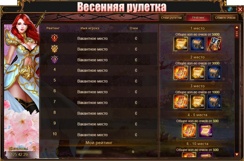 Каждое использование рулетки приносит вам очки события, отображаемые в Рейтинге Весенней Рулетки. В этот раз счастливчикам достанутся [Карта] ТорОранжевый свиток опытаОсобый свиток призываФиолетовый свиток опытаСвиток Призыва и Сундук самоцветов