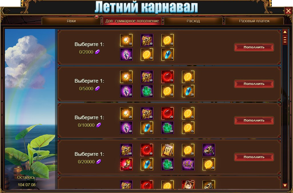 Обратите внимание, что в данной разновидности события вы можете выбрать один из двух вариантов наград для получения после суммарного пополнения на определенные суммы. После выбора одного из варианта наград второй вариант станет недоступен.