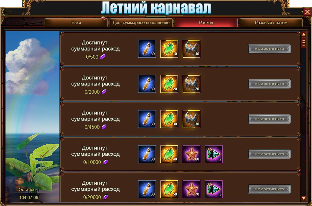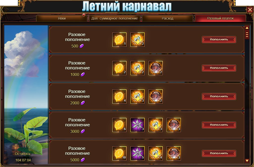 Пополните счет на определенные суммы за пять дней события и получите АпельсиныСундуки пробуждения богиниМрачные одеждыКристаллы шлифовки, Эссенции пробуждения, Камни мудрости, Изумруды, Карты героя класса SSR, Сундуки снаряжения скакуна (фиол.), Простые горны, Сундуки снаряжения героя (фиол.), [Карта] Шлем невидимости, Сундуки снаряжения скакуна (оранж.), Сундуки снаряжения героя (оранж.), Богиню Льда, [Карта] Хеймдалль, Отличное пугало, Обучающее устройство.