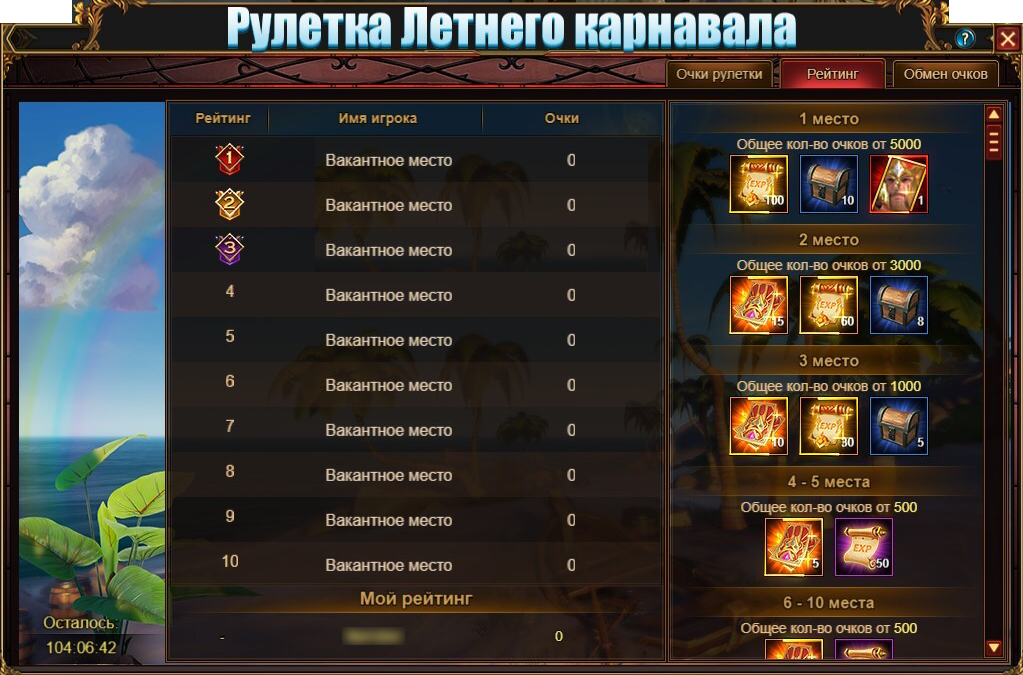 Каждое использование рулетки приносит вам очки события, отображаемые в Рейтинге Рулетки Летнего Карнавала. В этот раз счастливчикам достанутся [Карта] ХеймдалльОранжевый свиток опытаОсобый свиток призываФиолетовый свиток опытаСвиток Призыва и Сундук самоцветов