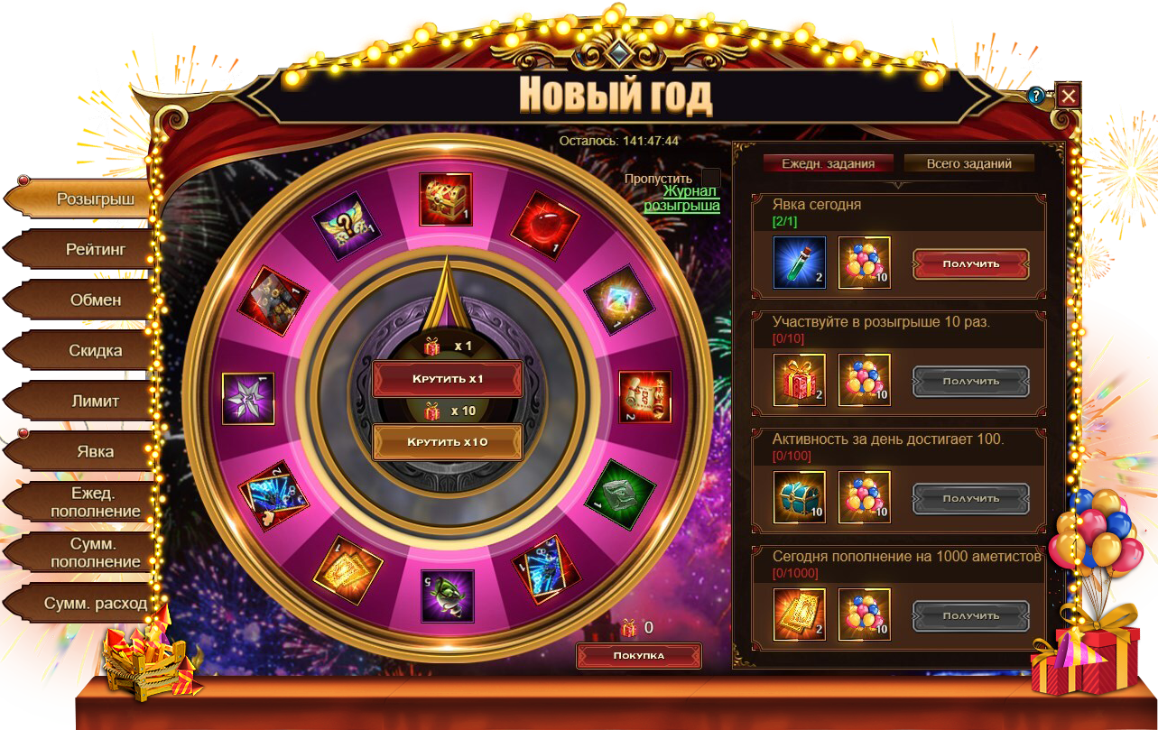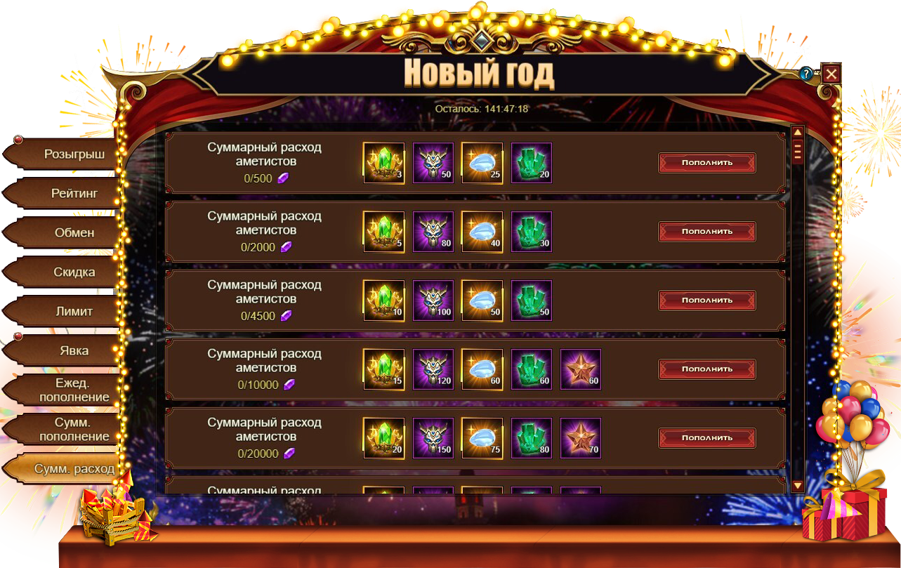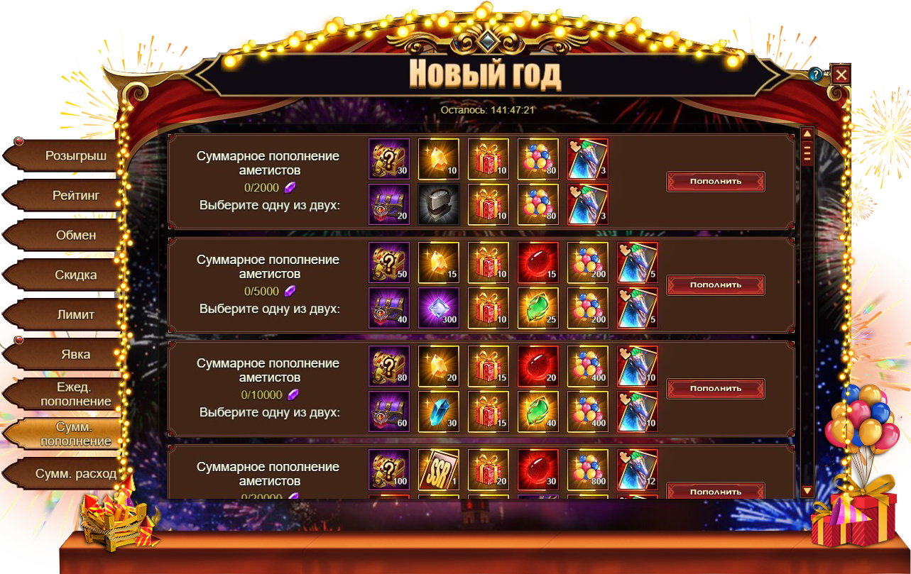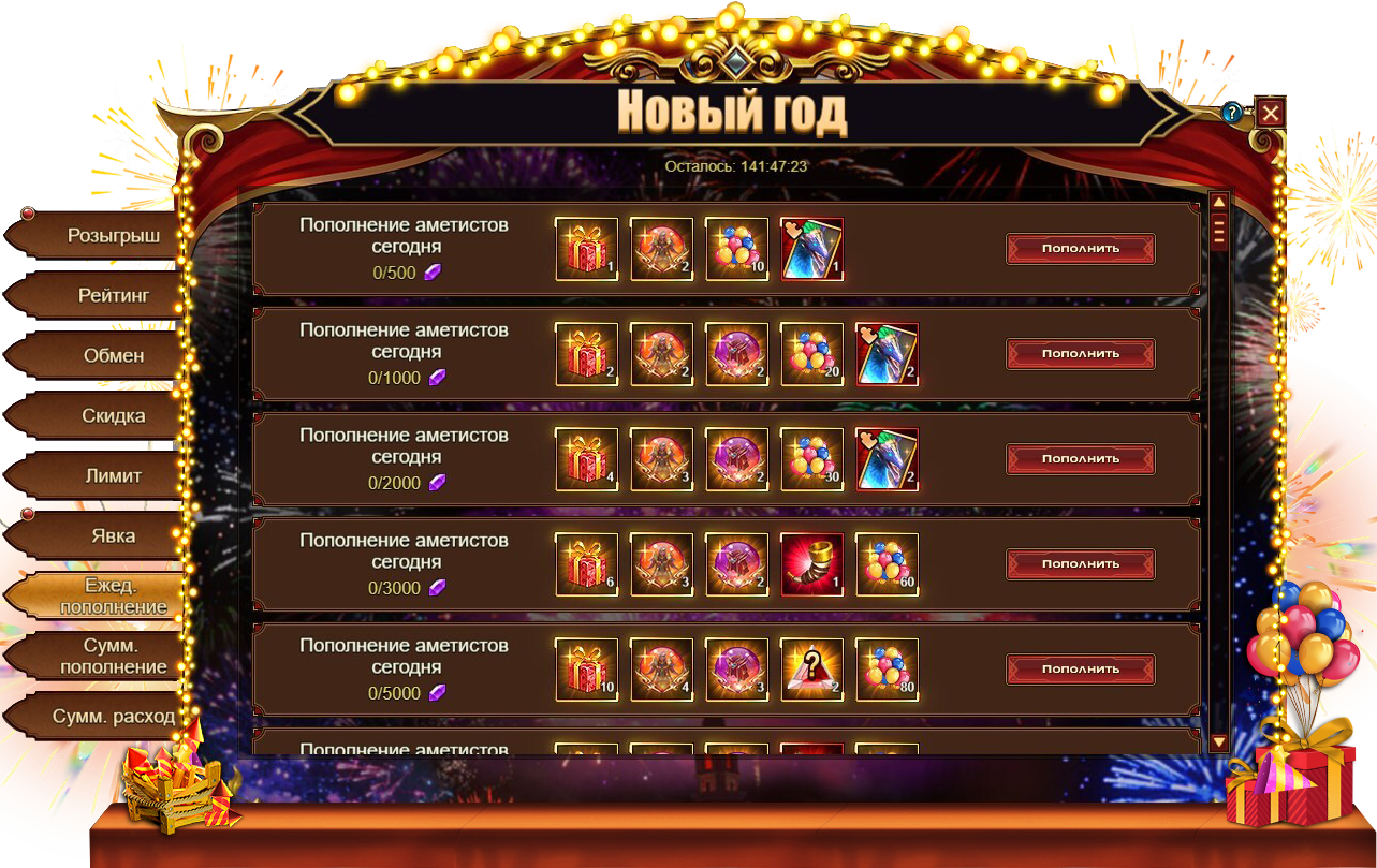 За пополнение счета на определенное количество аметистов за один день, вы можете получить: Монета фортуны, Сфера священного наряда, Шарики, [Фрагмент] Виверна, Сюрприз, Простой горн, Сундук кристаллов 7 ур., Сундук с кодексом, [Героич.] Стигмат, Солнечный камень души.