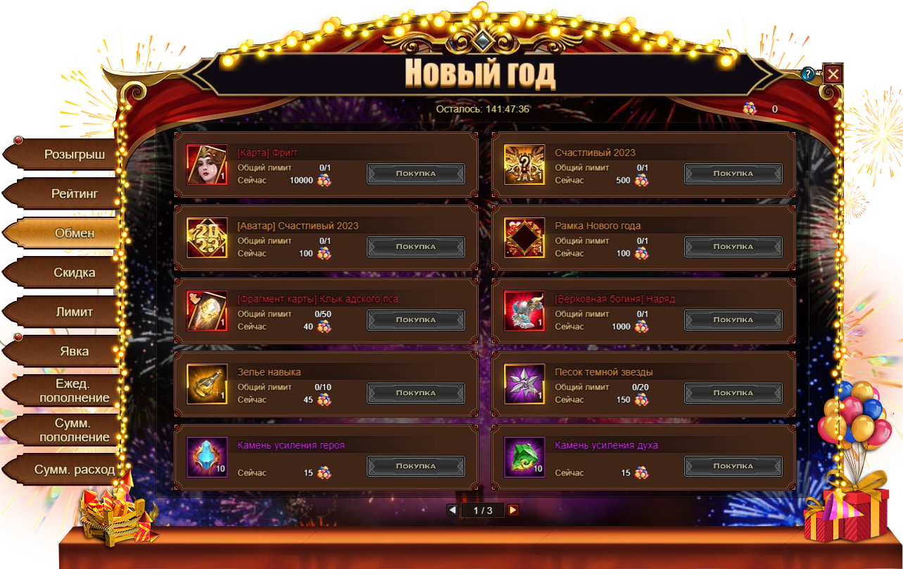Свечи, собранные во время данного Фестиваля, позволяют приобрести множество интересных предметов, в том числе и эксклюзивных для данного события: [Карта] Фригг, титул Счастливый 2023[Аватар] Счастливый 2023Рамка Нового Года[Фрагмент карты] Клык адского пса. Если эксклюзивные предметы вас не интересуют, всегда можно обменять Свечи на полезные ресурсы. Например, на Зелье навыкаПесок темной звезды или Камень усиления героя.