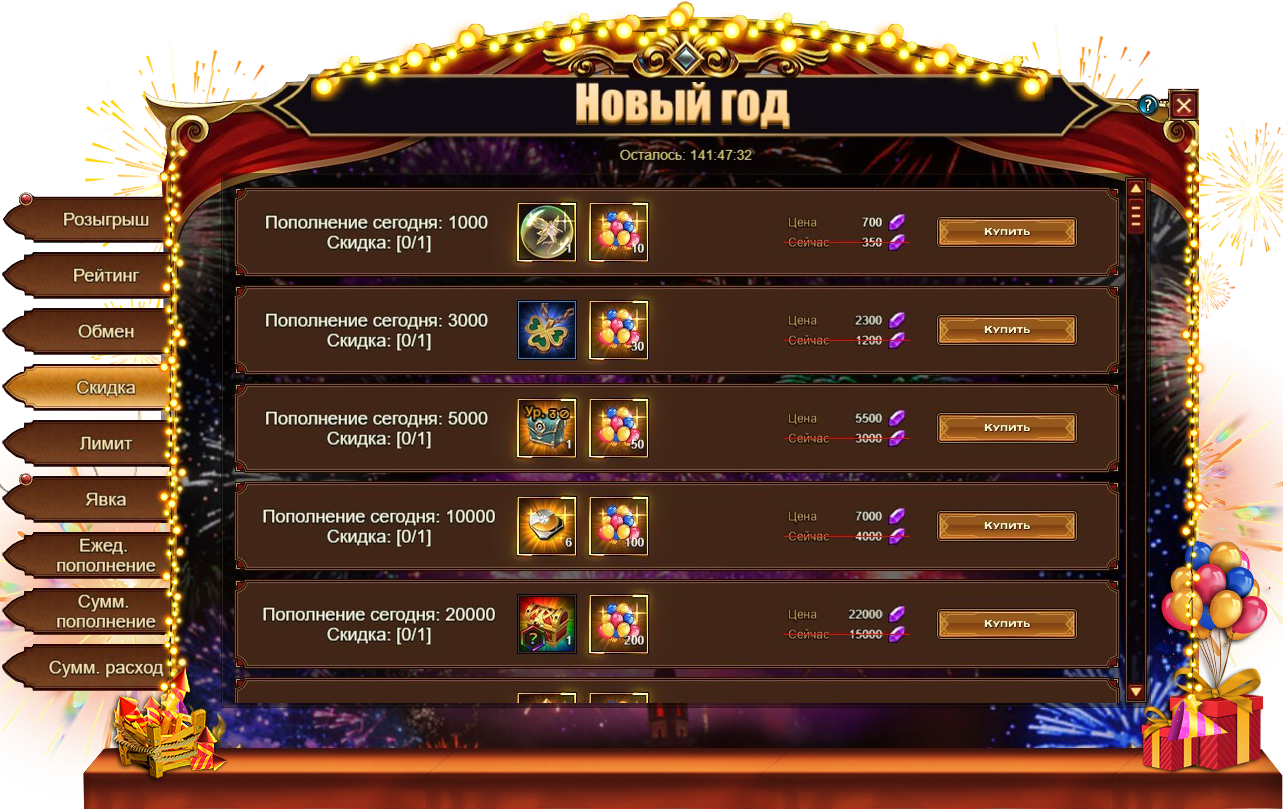 Обратите внимание, для активации скидки необходимо выполнить условие из первого столбца. Например, на скриншоте ниже, для приобретения со скидкой набора из Легендарного Эльфа и 10 Шариков необходимо пополнить счет на 1000.