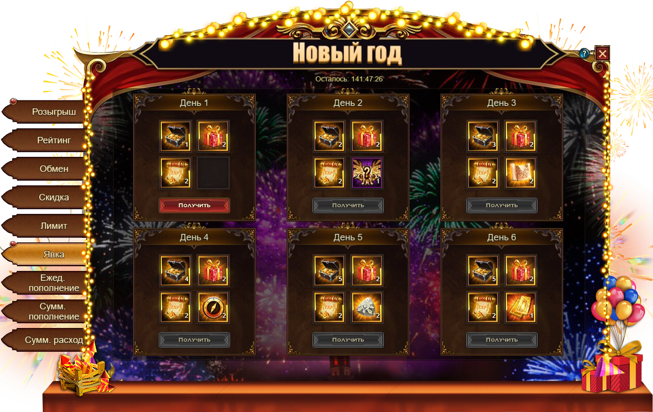 За посещение события ежедневно становятся доступны различные подарки. Например: СюрпризСумка золотаОранжевый свиток опыта, уникальный титул Удачный 2023Потерянная картаПропуск на Арену и Особый свиток призыва.