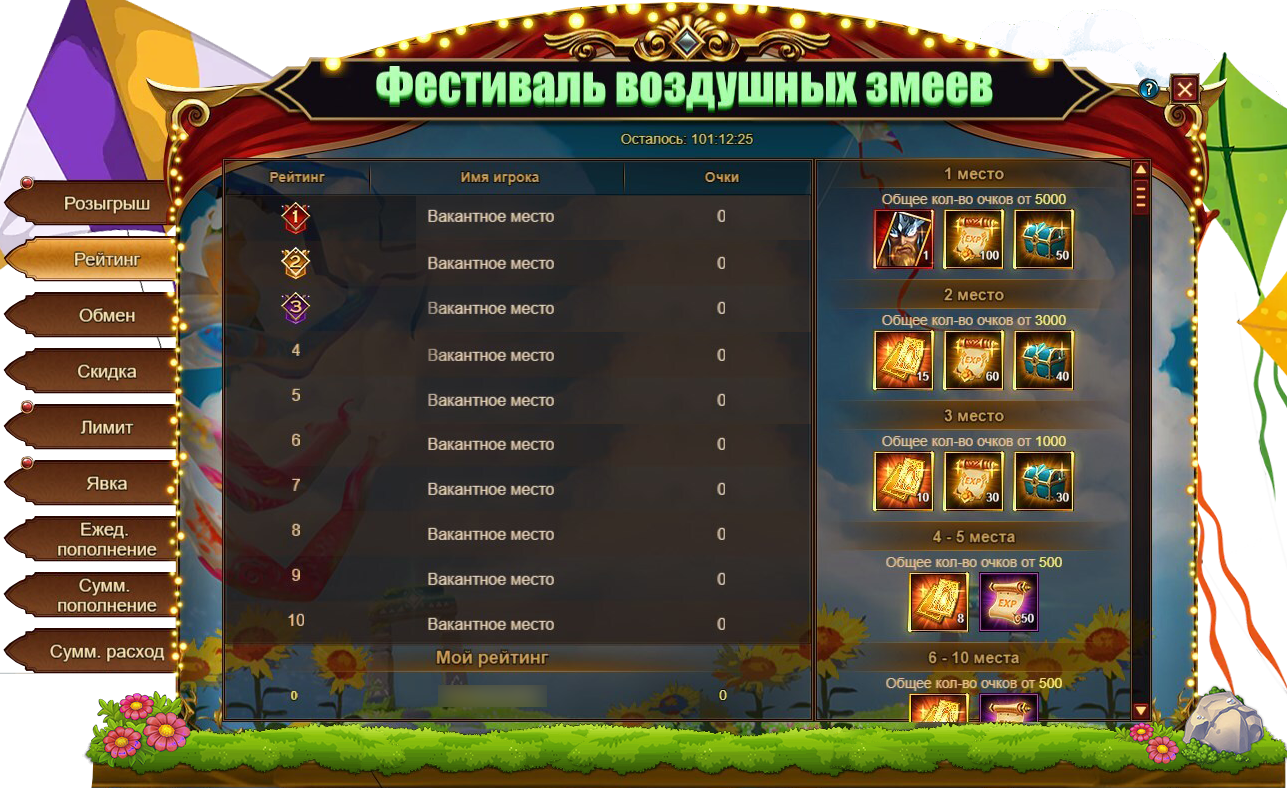 За посещение события ежедневно становятся доступны различные подарки. Например: Воздушный змейСумка золота, Оранжевый свиток опыта, уникальный титул В небо!Потерянная картаПропуск на Арену и Свиток славы.