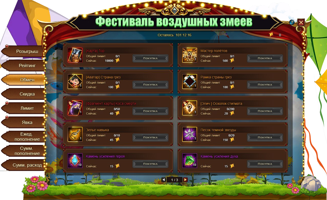 Свечи, собранные во время данного Фестиваля, позволяют приобрести множество интересных предметов, в том числе и эксклюзивных для данного события: [Карта] Тор, титул Мастер полетов[Аватар] Страна грезРамка Страны грез[Фрагмент карты] Коса смерти. Если эксклюзивные предметы вас не интересуют, всегда можно обменять Золотых воздушных змеев на полезные ресурсы. Например, на Зелье навыкаПесок темной звезды или Камень усиления героя.