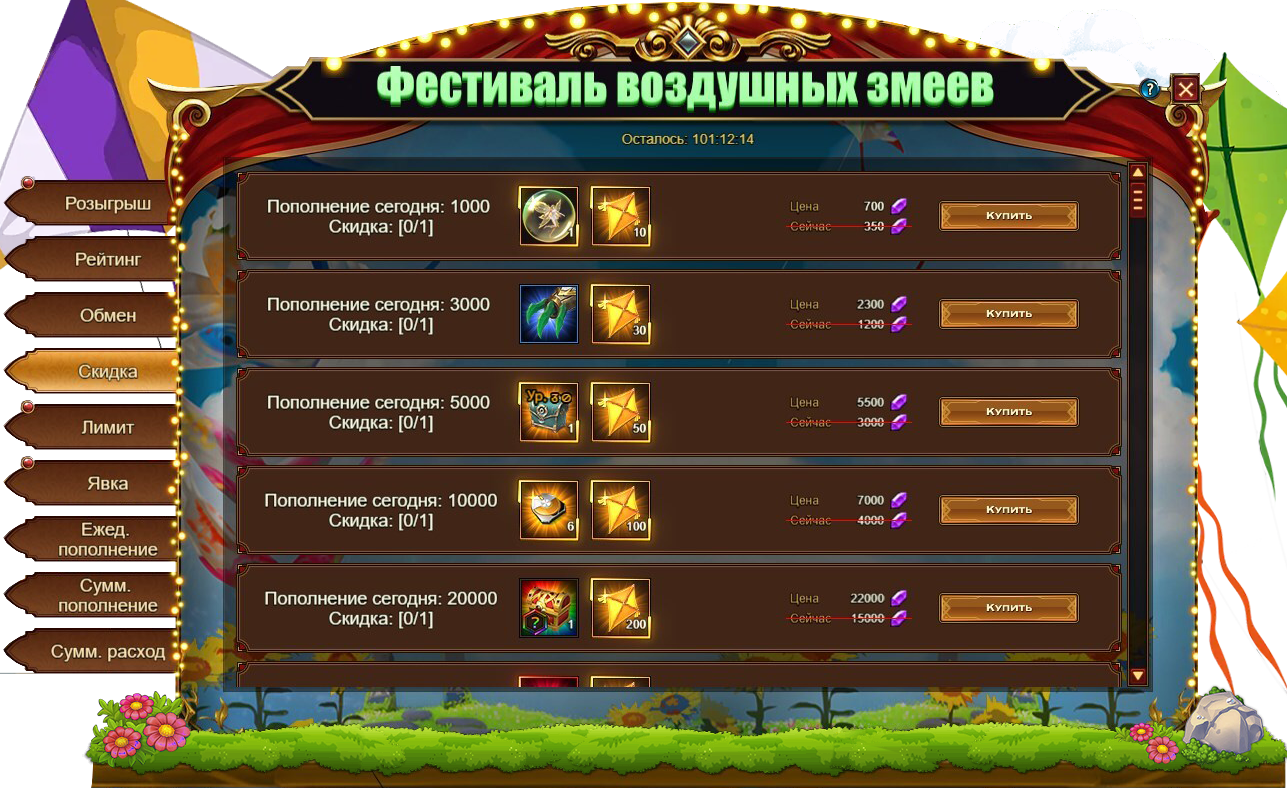 Здесь любопытные искатели приключений могут отыскать временные предложения, доступные в течение ограниченного времени и в ограниченном количестве. Группы товаров доступы с 8:00 до 11:59, с 12:00 до 17:59, с 18:00 до 20:59 и с 21:00 до 7:59. В этот раз вы можете получить в том числе: Воздушный змей, золотой воздушный змей, Кристалл пробуждения, Камень повышения духа, Сундук души 1, Кристалл души крыльев.