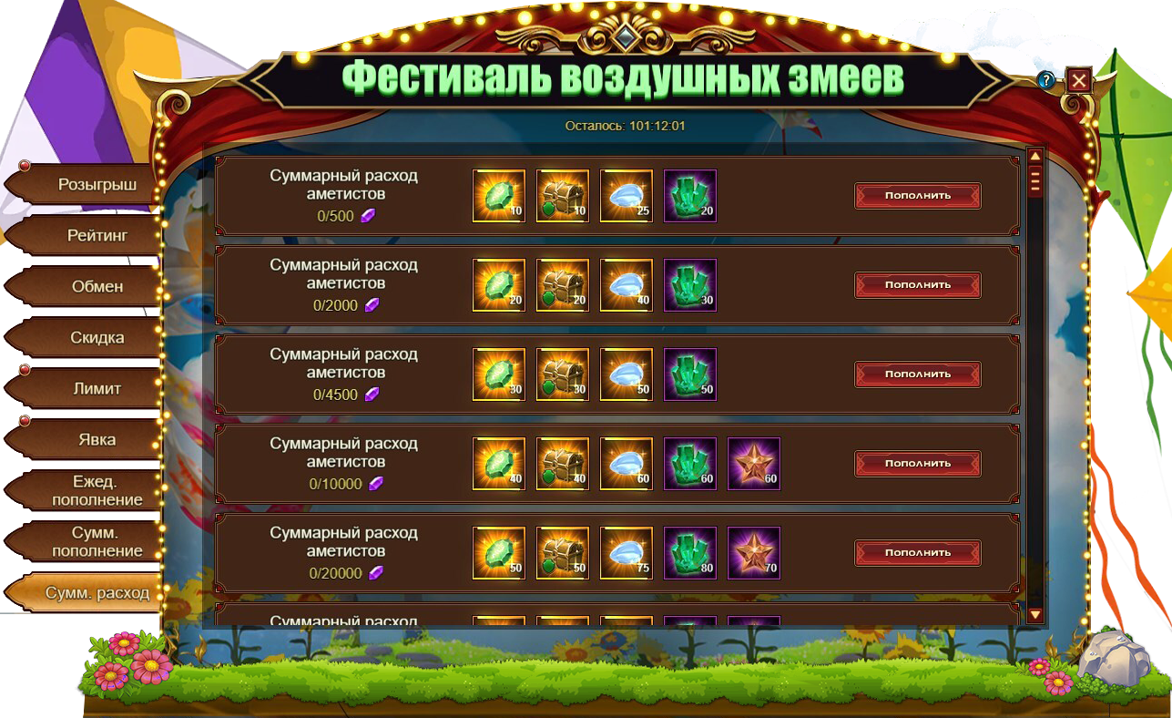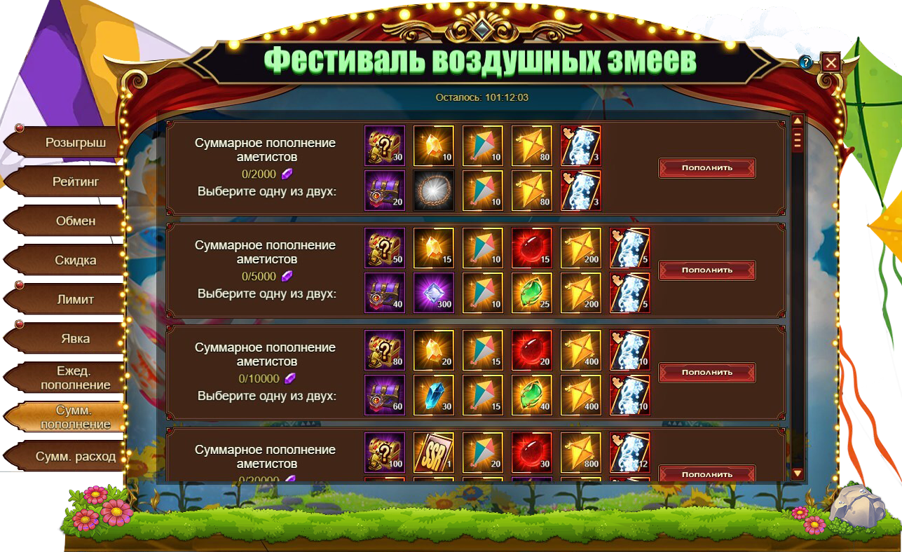 За пополнение счета на определенное количество аметистов за один день, вы можете получить: Воздушный змей, Золотой воздушный змейДуша богиниСундук редкостейФрагмент ледяных крыльев, Песок темной звездыСундук самоцветов 8 ур.Сундук с кодексом[Героич.] СтигматСолнечный камень души.