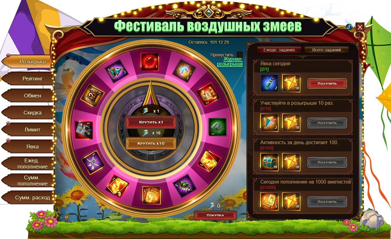 За пополнение счета на определенное количество аметистов за один день, вы можете получить: Воздушный змей, Золотой воздушный змейДуша богиниСундук редкостейФрагмент ледяных крыльев, Песок темной звездыСундук самоцветов 8 ур.Сундук с кодексом[Героич.] СтигматСолнечный камень души.