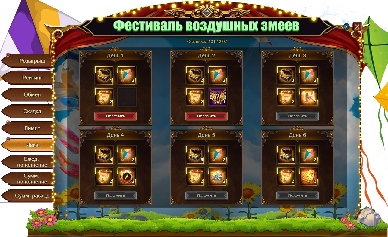 За посещение события ежедневно становятся доступны различные подарки. Например: Воздушный змей, Сумка золота, Оранжевый свиток опыта, уникальный титул В небо!, Потерянная карта, Пропуск на Арену и Свиток славы.