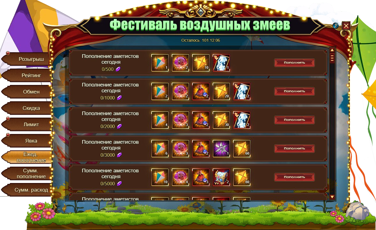 За пополнение счета на определенное количество аметистов за один день, вы можете получить: Воздушный змей, Золотой воздушный змей, Душа богини, Сундук редкостей, Фрагмент ледяных крыльев, Песок темной звезды, Сундук самоцветов 8 ур., Сундук с кодексом, [Героич.] Стигмат, Солнечный камень души.