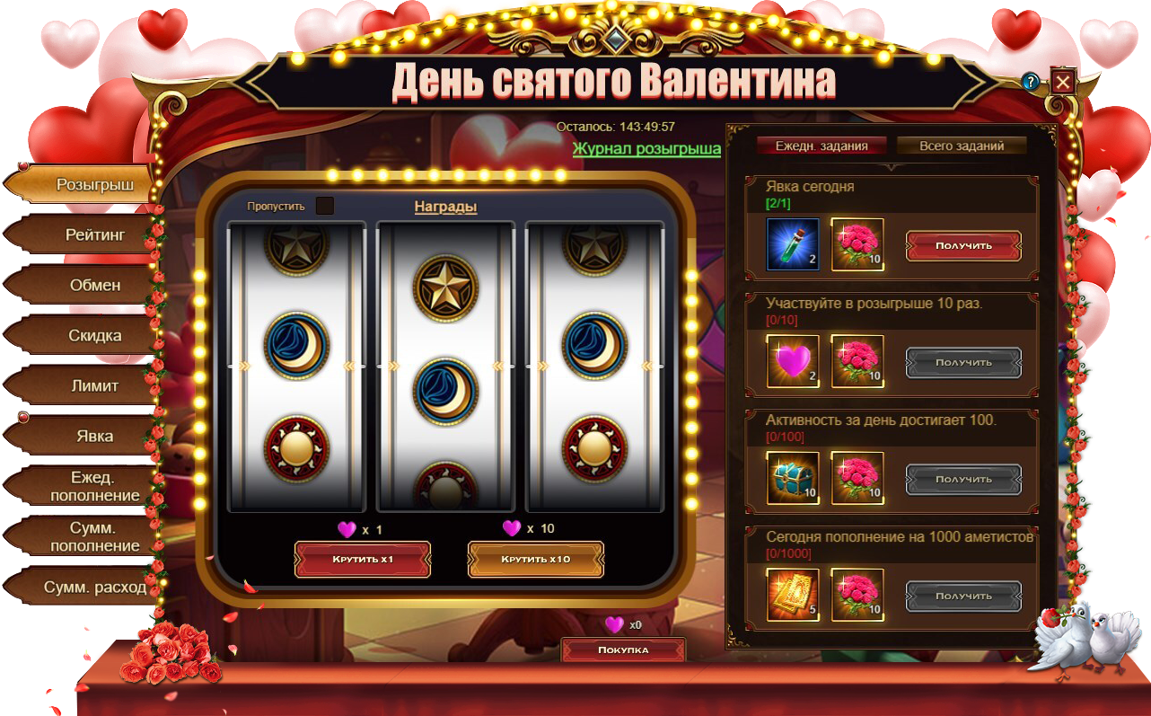 Участвуйте в розыгрыше различных ценных предметов, чтобы получить: Свиток Славы, Фрагмент крыльев Купидона, Камень мудрости, Осколок метеорита, Песок темной звезды, Селенит, Цитрин, Сундук магических ядер 4 ур., Крылья купидона целиком и даже самогого главного обольстителя Мидгарда Локи