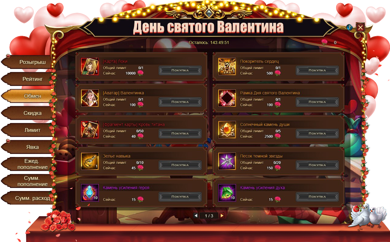 Свечи, собранные во время данного Фестиваля, позволяют приобрести множество интересных предметов, в том числе и эксклюзивных для данного события: [Карта] Локи, титул Покоритель сердец[Аватар] ВалентинкаРамка Дня святого Валентина[Фрагмент карты] Кровь Титана. Если эксклюзивные предметы вас не интересуют, всегда можно обменять Букеты роз на полезные ресурсы. Например, на Зелье навыкаПесок темной звезды или Камень усиления героя.