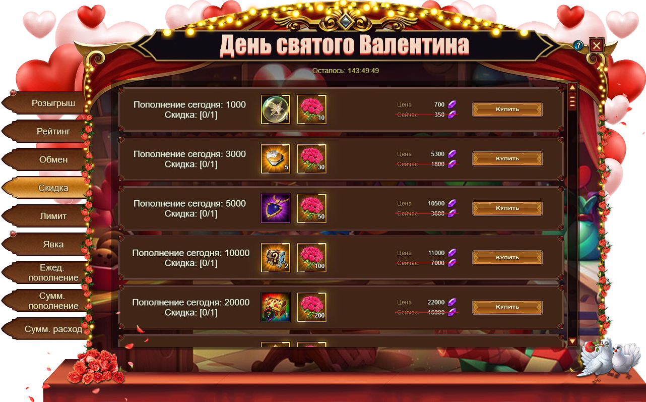 Обратите внимание, для активации скидки необходимо выполнить условие из первого столбца. Например, на скриншоте ниже, для приобретения со скидкой набора из Легендарного Эльфа и 10 Букетов роз необходимо пополнить счет на 1000.