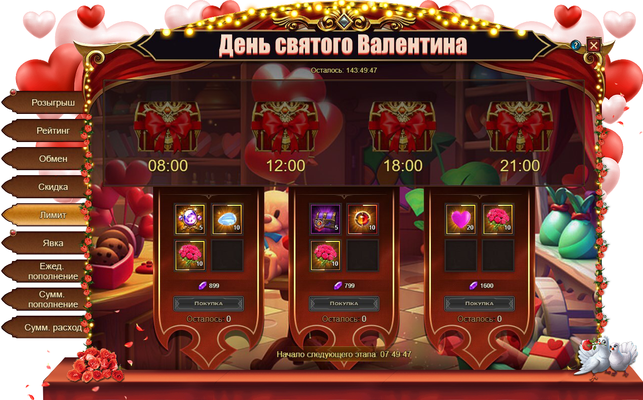 Здесь любопытные искатели приключений могут отыскать временные предложения, доступные в течение ограниченного времени и в ограниченном количестве. Группы товаров доступы с 8:00 до 11:59, с 12:00 до 17:59, с 18:00 до 20:59 и с 21:00 до 7:59. В этот раз вы можете получить в том числе: Камень повышения героя, Частица сердца, Букет роз, Сундук души 1, Кристалл души крыльев, Сердечки.