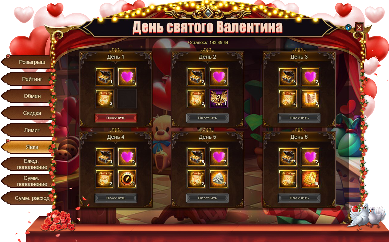 За посещение события ежедневно становятся доступны различные подарки. Например: СердечкиСумка золотаОранжевый свиток опытауникальный титул СердцеевПотерянная картаПропуск на Арену и Свиток славы.