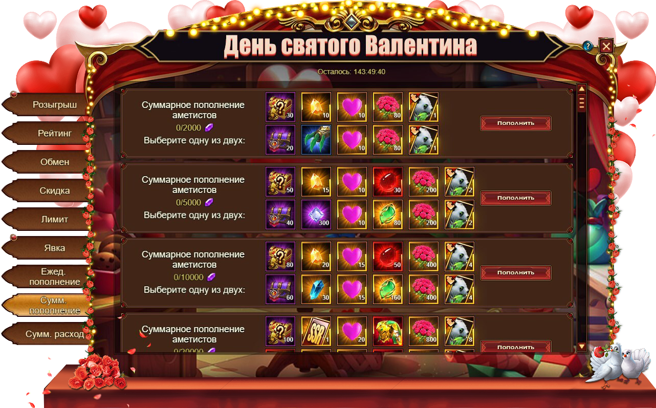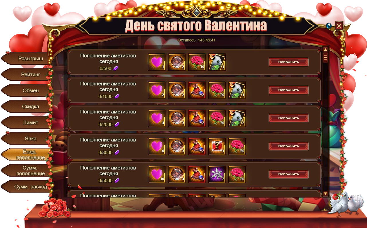 За пополнение счета на определенное количество аметистов за один день, вы можете получить: СердечкиКамень пробужденияБукет роз, Фрагмент панды, Сундук редкостей, Сундук кристаллов 8 ур., Песок темной звезды, Кодекс крыльев святости, Сундук с кодексом, [Фрагмент карты] Тюр!