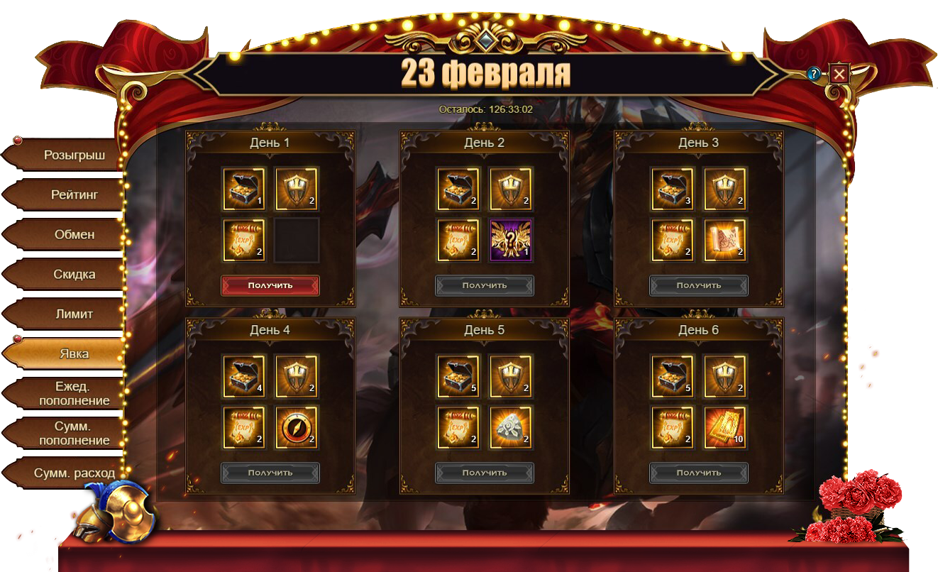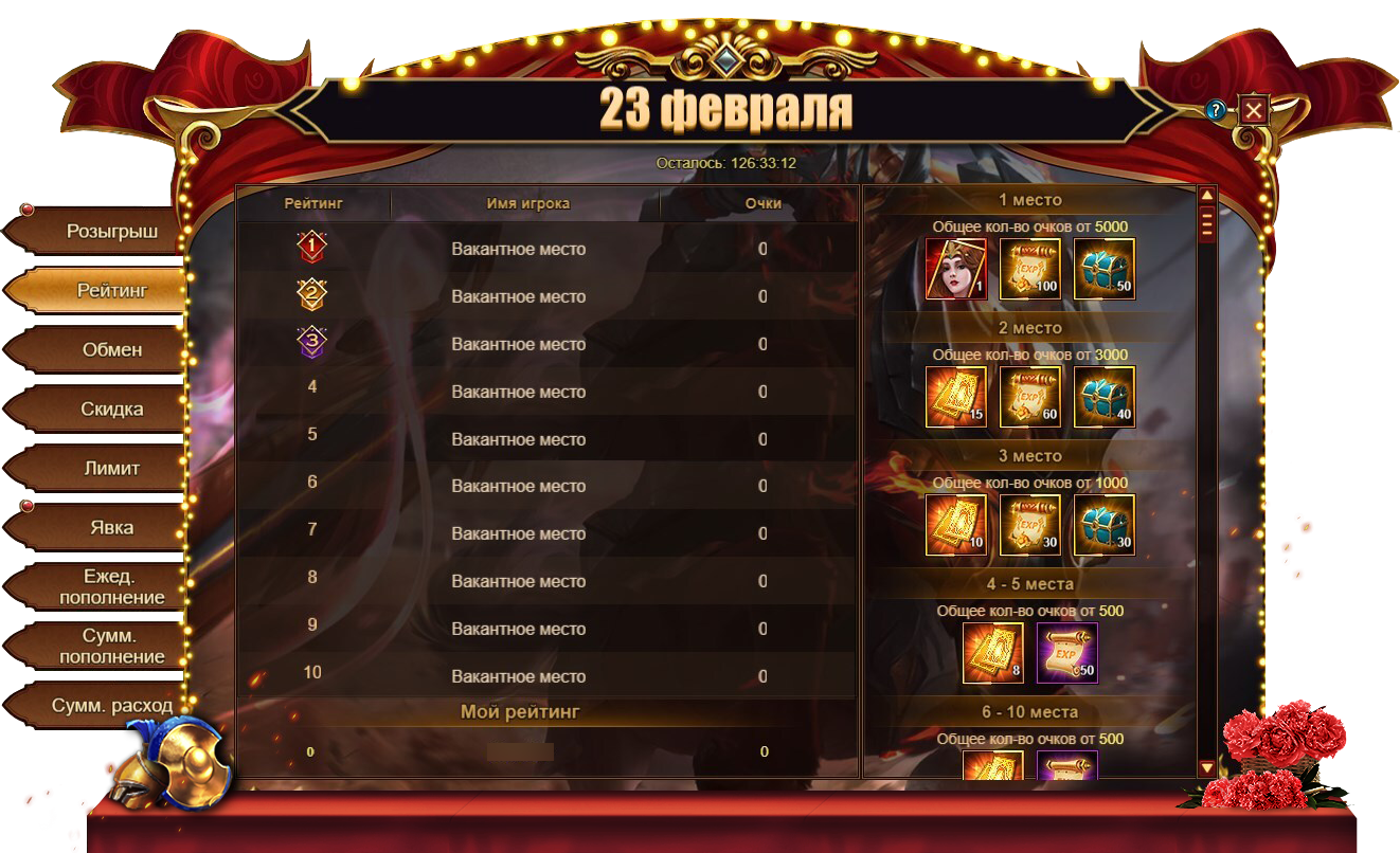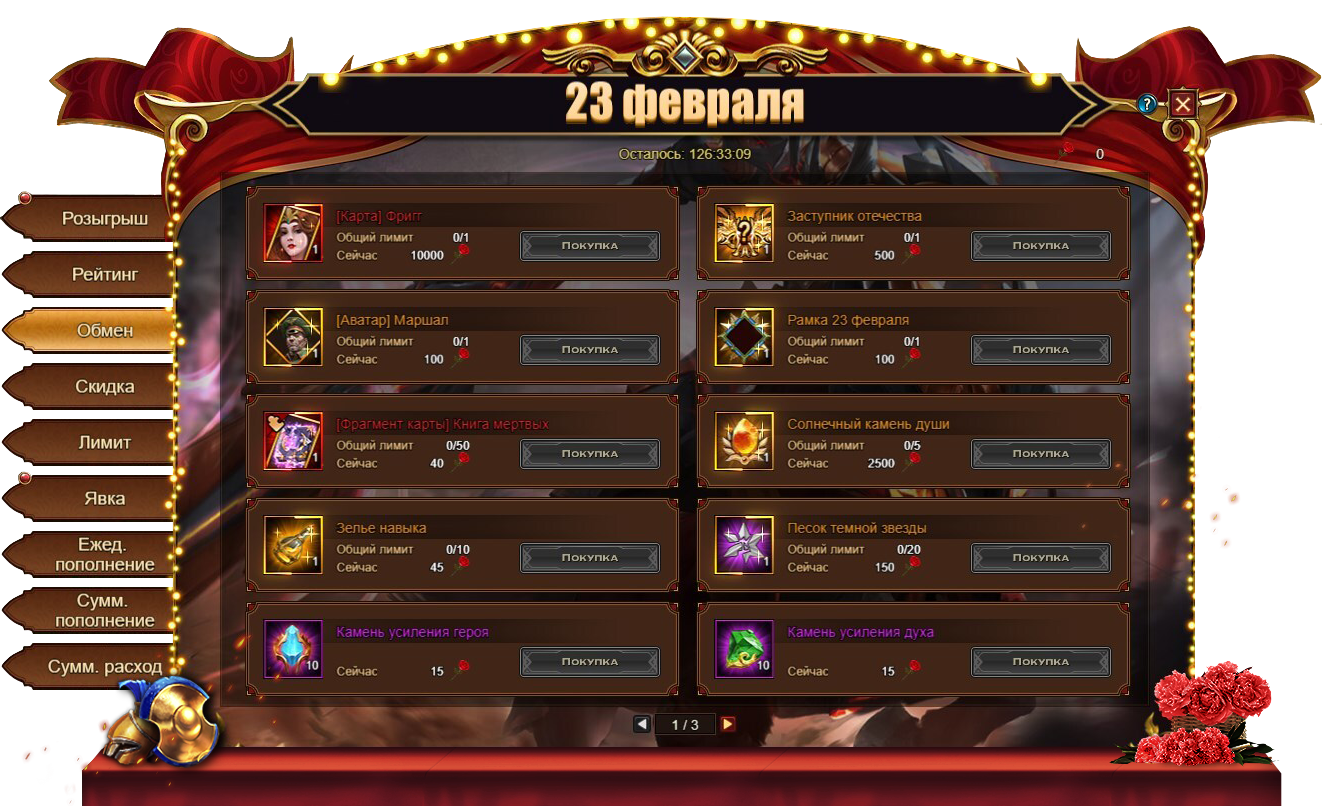 Свечи, собранные во время данного Фестиваля, позволяют приобрести множество интересных предметов, в том числе и эксклюзивных для данного события: [Карта] Фригг, титул Заступник Отечества[Аватар] МаршалРамка 23 февраля. Если эксклюзивные предметы вас не интересуют, всегда можно обменять Букеты на полезные ресурсы. Например, на Зелье навыкаПесок темной звезды или Камень усиления героя.