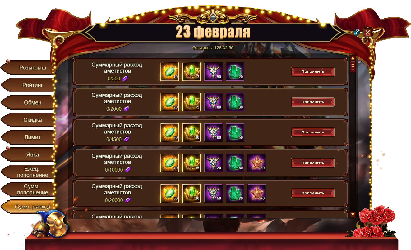 За пополнение счета на определенное количество аметистов за один день, вы можете получить: Орден, Сфера священного наряда, Букет, [Фрагмент] Дракон тьмы, Сундук редкостей, Сундук самоцветов 8 ур., [Фрагмент карты] Тюр, Кодекс крыльев святости, Сундук с кодексом, [Героич.] Стигмат, Турмалин.