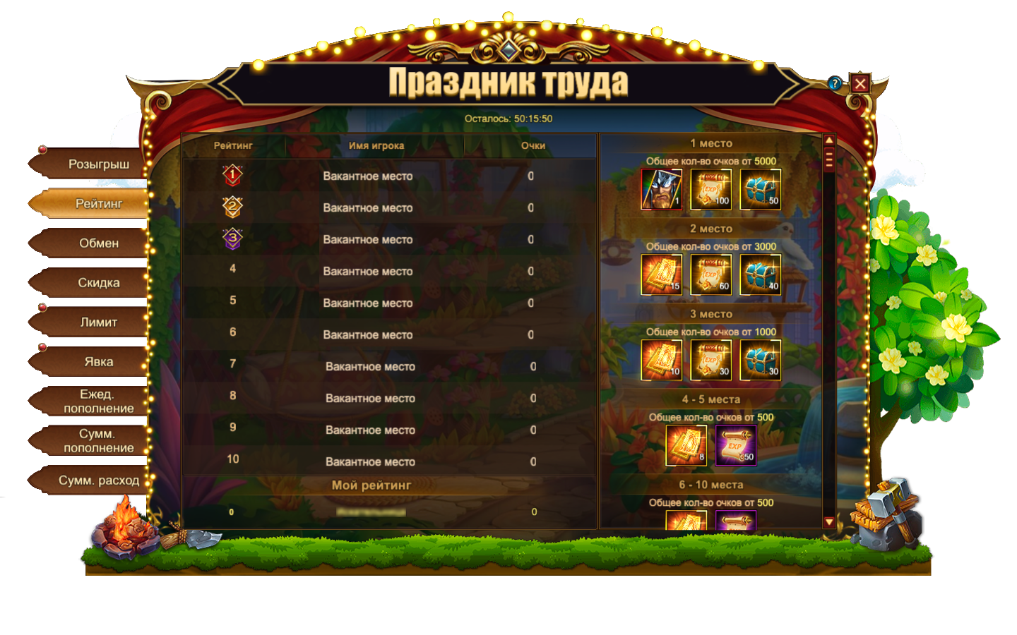 За участие в Розыгрыше вы получаете специальные очки, определяющие ваше положение в Рейтинге фестиваля. В зависимости от положения в рейтинге можно получить: Свитки славыОранжевые свитки опытаОсобые сундуки материаловФиолетовые свитки опыта и даже героя класса UR - всемогущего Тора