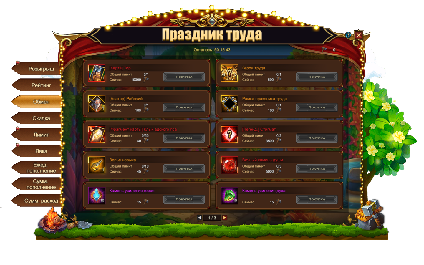 Обратите внимание, для активации скидки необходимо выполнить условие из первого столбца. Например, на скриншоте ниже, для приобретения со скидкой набора из Легендарного Эльфа и 10 Молотков необходимо пополнить счет на 1000.