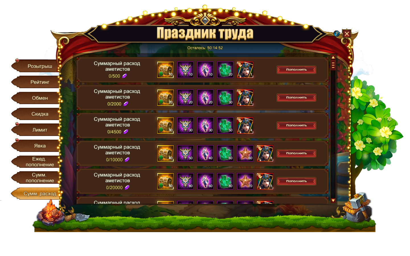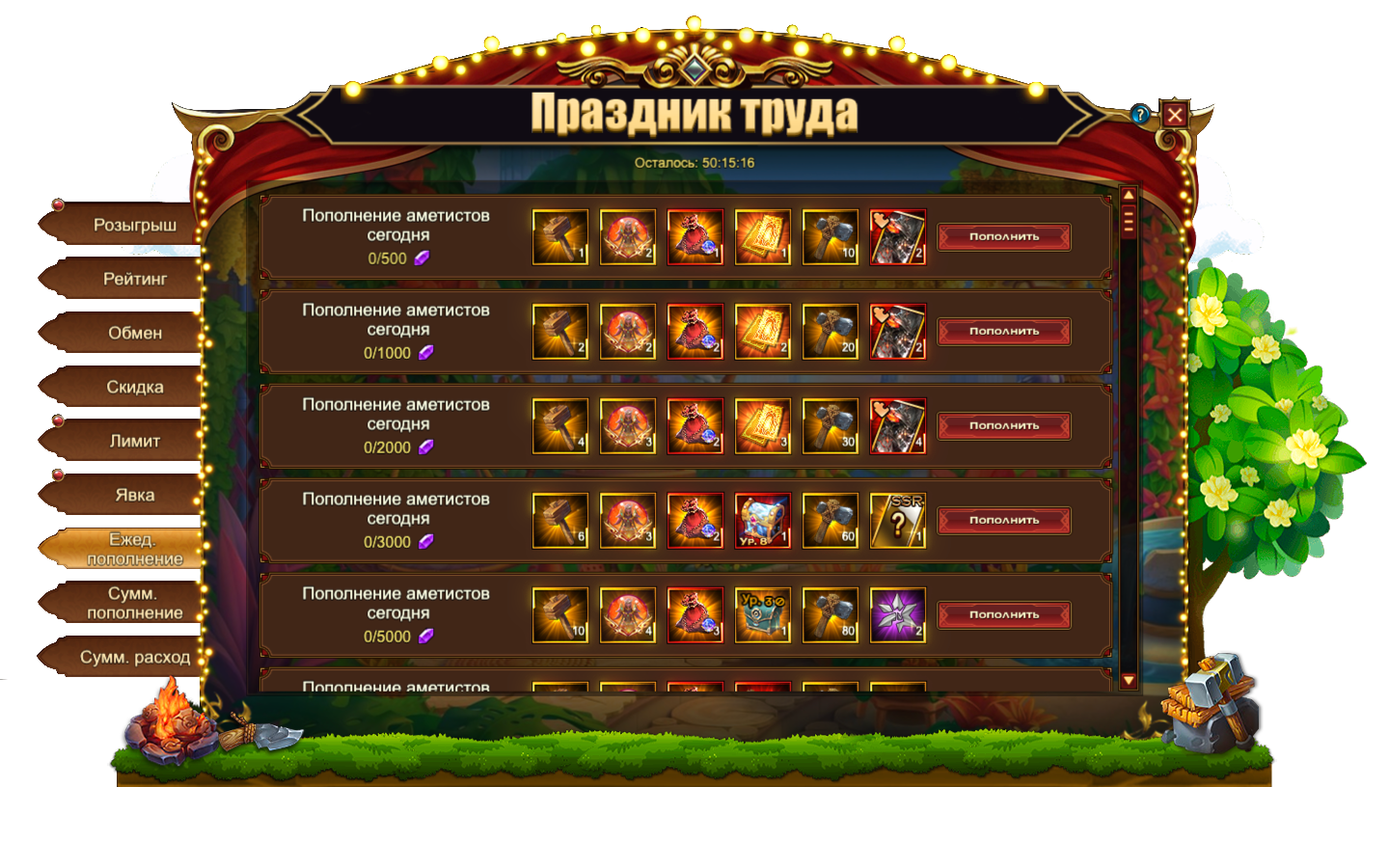 За пополнение счета на определенное количество аметистов за один день, вы можете получить: КиянкаМолотокСфера священного наряда, Свиток славы, Сундук карт SSR, Кодекс крыльев святости, Песок темной звезды, Оранжевое созвездие, Сущность артефакта, Сундук редкостей, [Фрагмент] Крушитель, Сундк самоцветов 8 ур., Сундук с кодексом, Сундук реликвий, [Фрагмент карты] Хеймдалль[Фрагмент карты] Тюр.