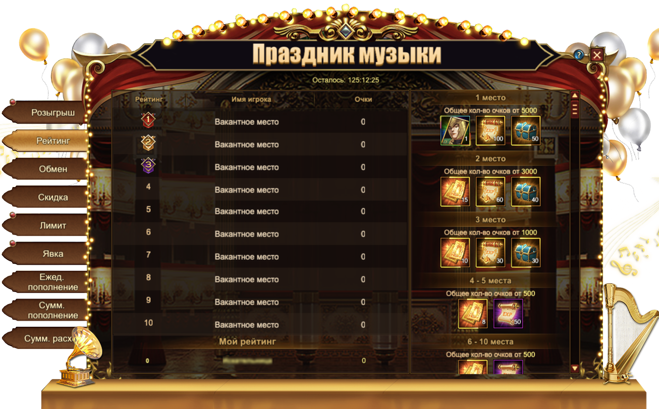 За участие в Розыгрыше вы получаете специальные очки, определяющие ваше положение в Рейтинге фестиваля. В зависимости от положения в рейтинге можно получить: Свитки славыОранжевые свитки опытаОсобые сундуки материаловФиолетовые свитки опыта и даже героя класса UR - хитроумного Локи