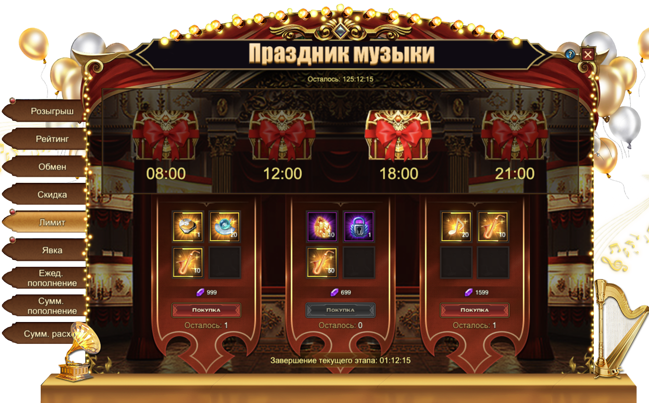 Здесь любопытные искатели приключений могут отыскать временные предложения, доступные в течение ограниченного времени и в ограниченном количестве. Группы товаров доступы с 8:00 до 11:59, с 12:00 до 17:59, с 18:00 до 20:59 и с 21:00 до 7:59. В этот раз вы можете получить в том числе: Саксофон, Нота, Обучающее устройство, Эссенция талисмана, Янтарь, Камень блокировки.