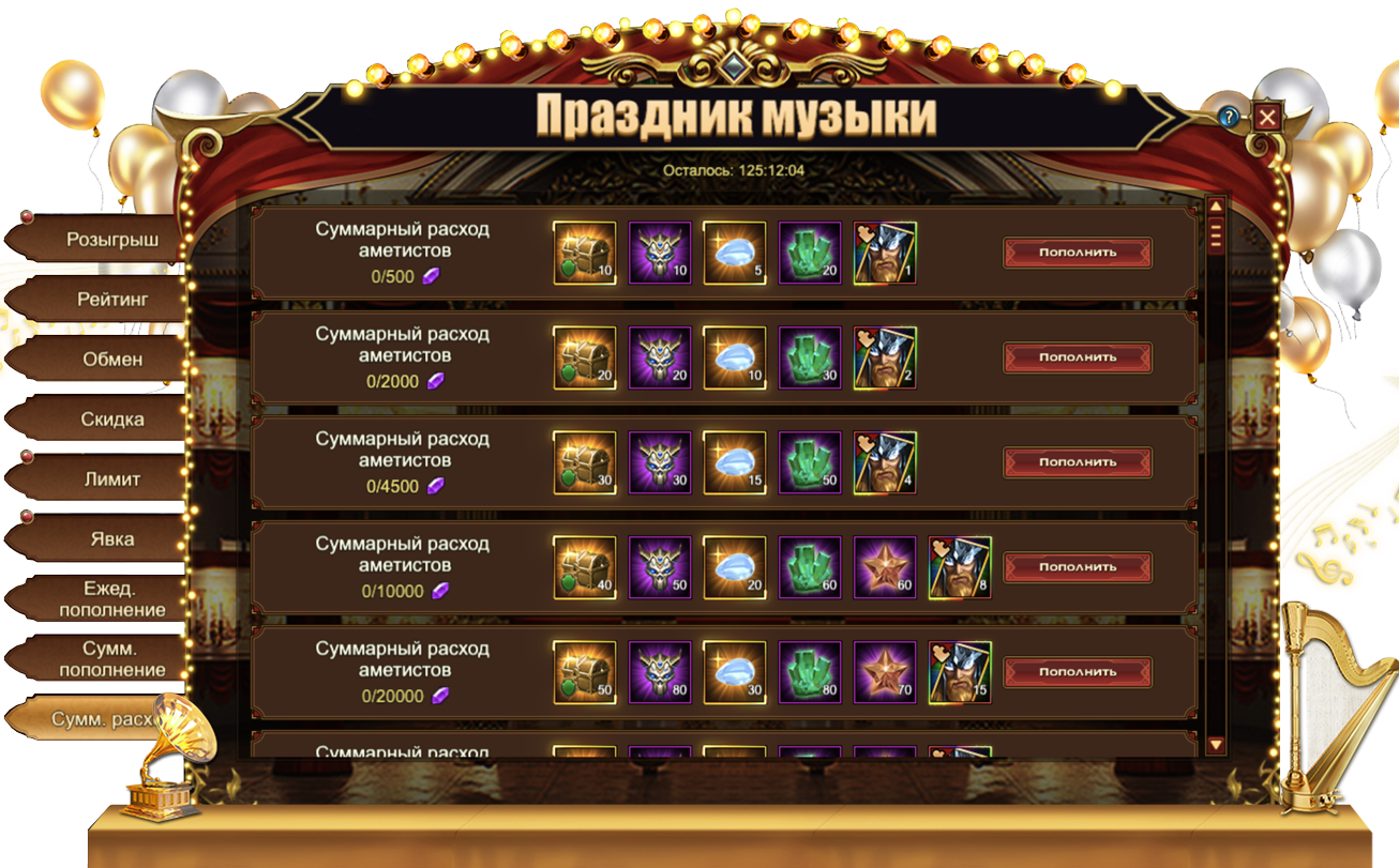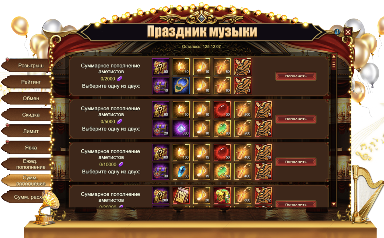 За пополнение счета на определенное количество аметистов за один день, вы можете получить: Сундук карт SR, НотаСаксофон, Душа обликаСвиток славыСундук карт SSRСундук кристаллов 8 ур., Песок темной звездыОранжевое созвездиеСущность артефакта, Кодекс крыльев святости, Сундук редкостей[Фрагмент] Крыльев дракона, Сундук с кодексом, Письмо с молитвой, Сундук реликвий[Фрагмент карты] Фригг[Фрагмент карты] Тюр.