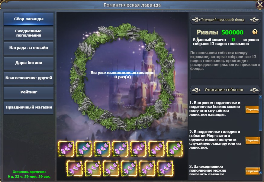 скрин ивента Романтическая лаванда - в данный момент 0 игроков собрали 13 видов ТЮЛЬПАНОВ 😃
