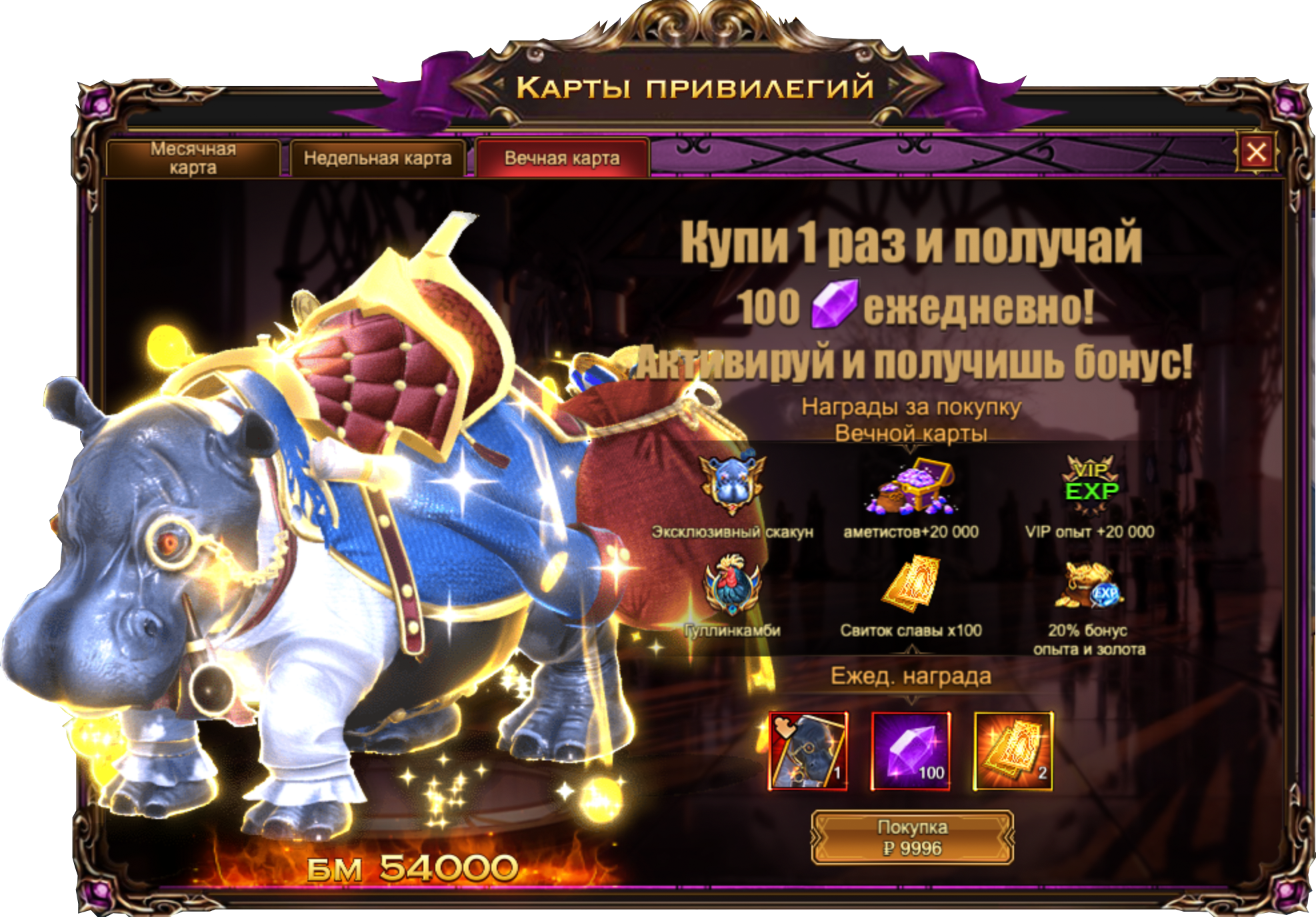 • Вечная карта — можно вечно смотреть на три вещи: как течет вода, как горит огонь и как ежедневные награды приходят на почту день за днем, неделю за неделей, месяц за месяцем, год за годом! Действительно вечная карта с целым рядом замечательных бонусов!
