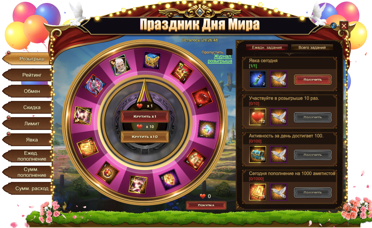 Участвуйте в розыгрыше различных ценных предметов, чтобы получить: Свиток славы, Фрагмент Свиньи, Кристалл души крыльев, Свинья, Пистолет, [Фрагмент Карты] Тюр, Сундук самоцветов 5 ур., Сундук наряда Бога Обмана, Камень мудрости, Осколок метеорита, Красный свиток опыта, Янтарь.